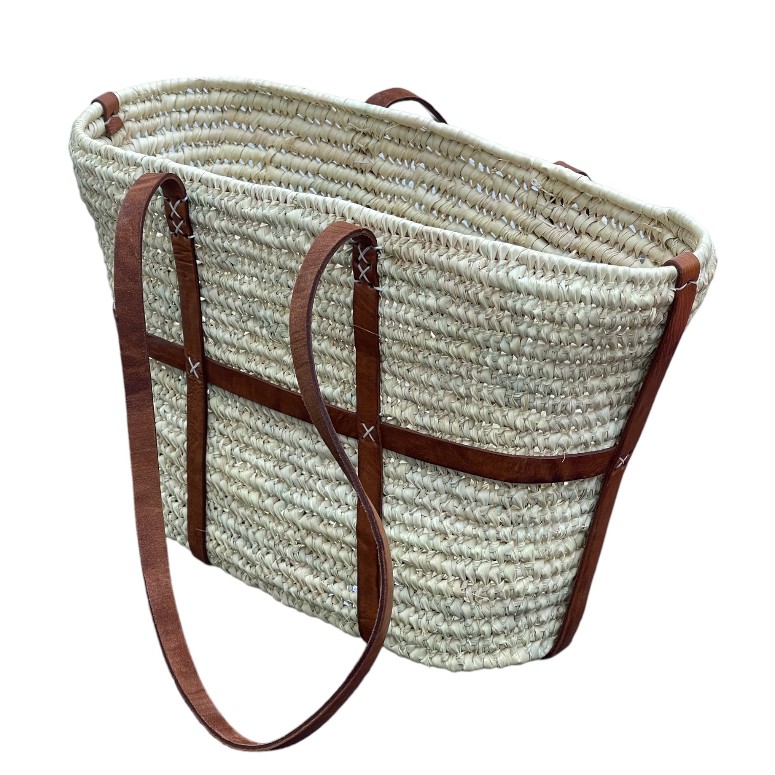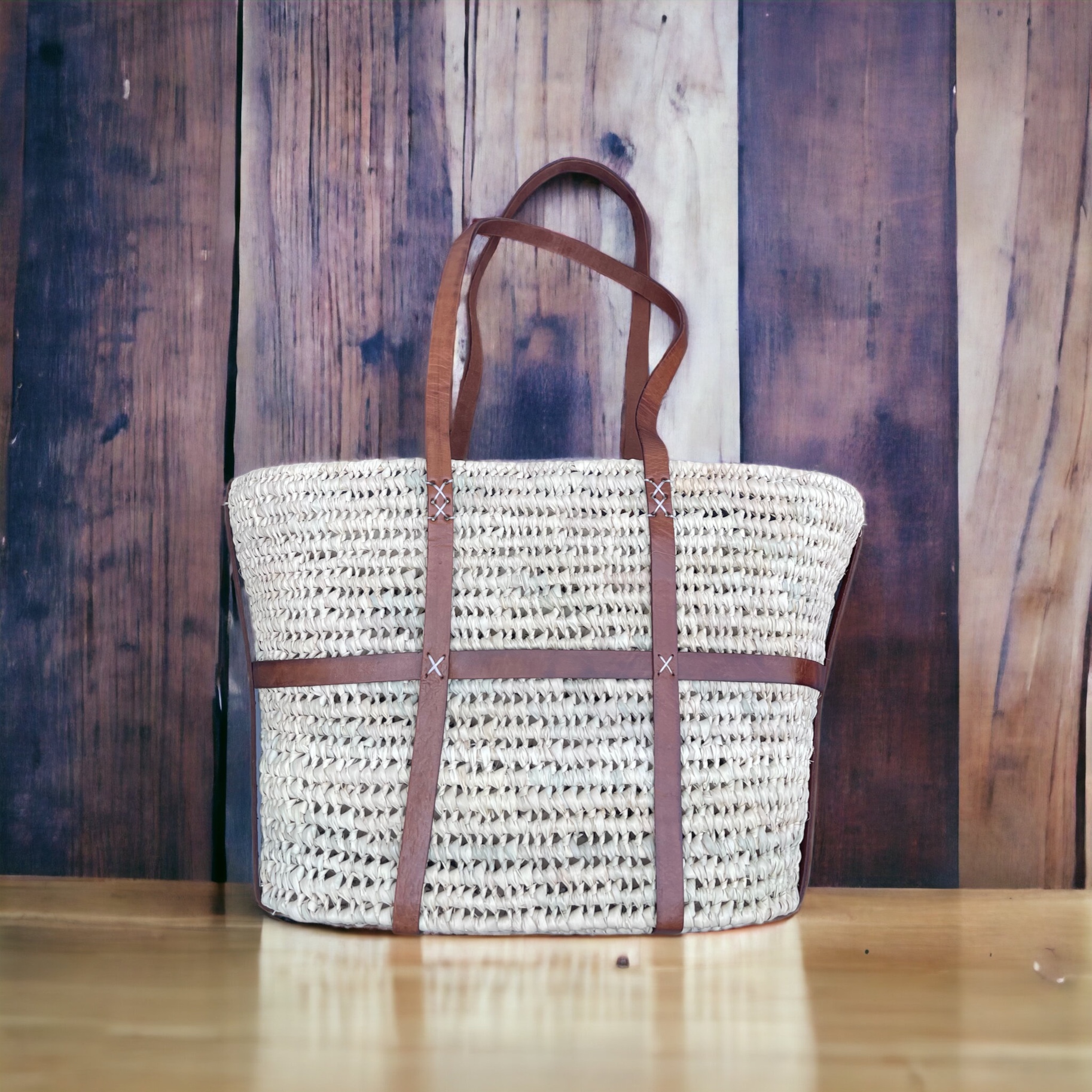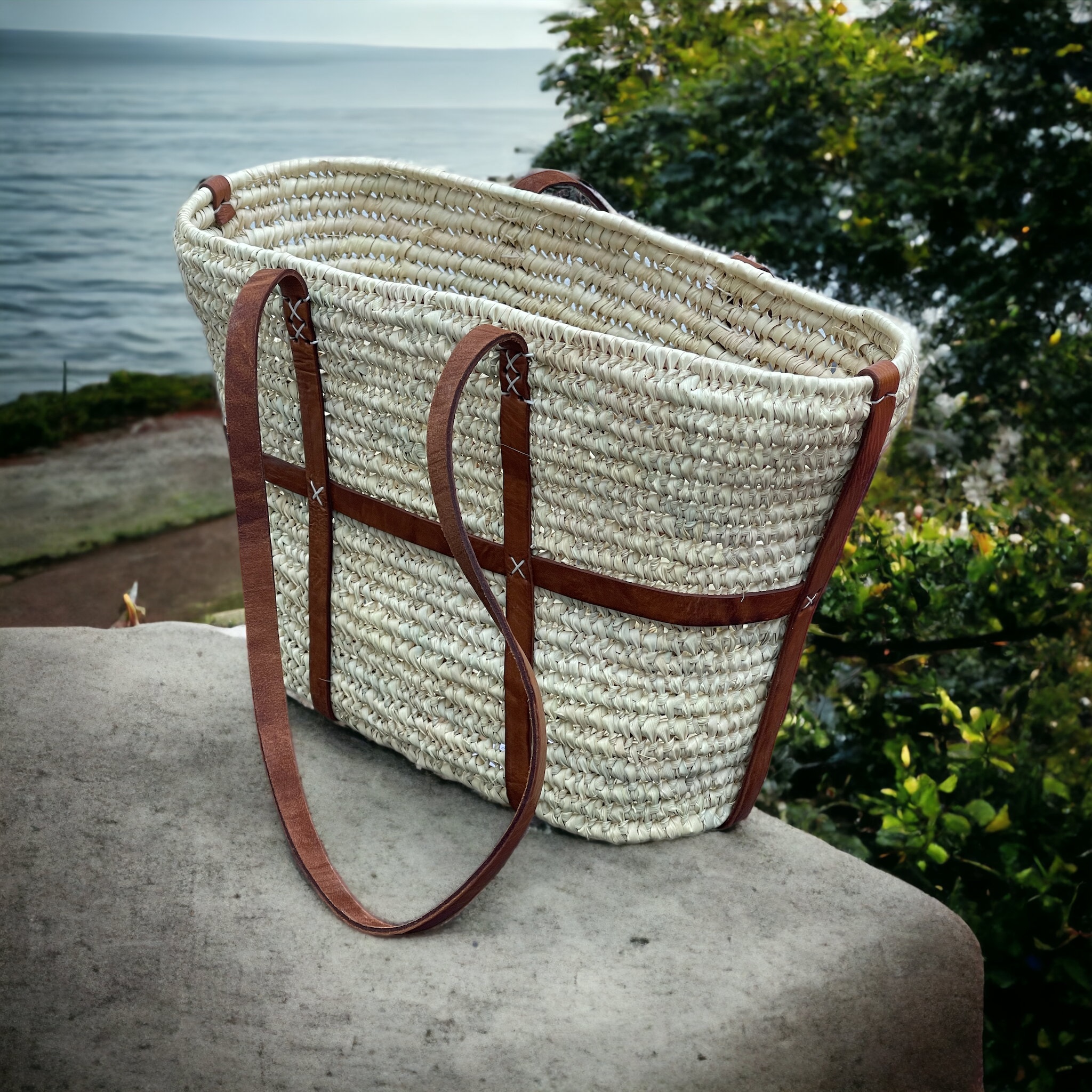Entdecken Sie die zeitlose Eleganz unserer handgeflochtenen Korbtasche aus echten Palmblattfasern mit edlen Lederapplikationen. Mit einer Länge von circa 42 cm und einer Höhe von 26 cm bietet sie ausreichend Platz für Ihre täglichen Essentials.