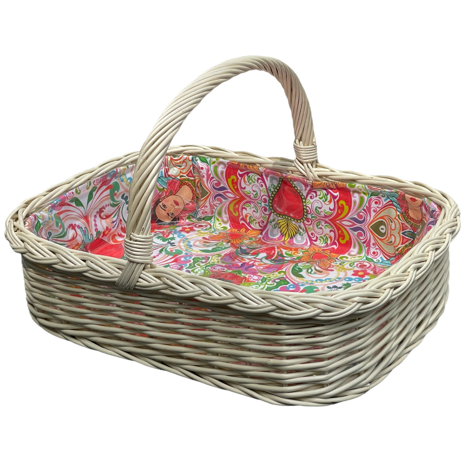 Stabiles Weidentablett mit Henkel und Futter garniert mit Stoff Frida.