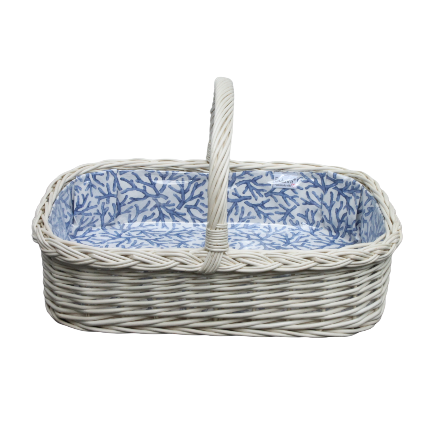 Stabiles Weidentablett mit Henkel und Futter garniert mit Stoff Koralle Blau.