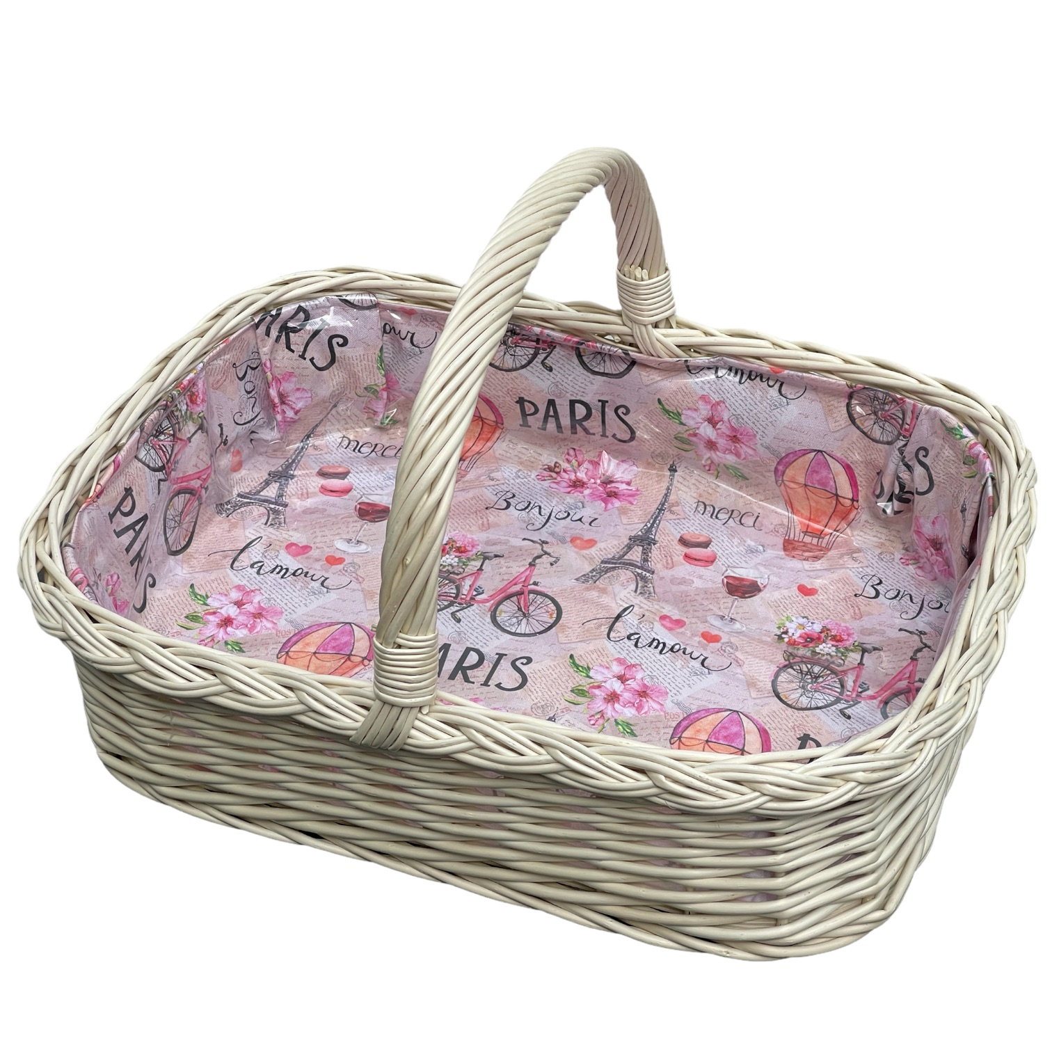 Stabiles Weidentablett mit Henkel und Futter garniert mit Stoff Paris.