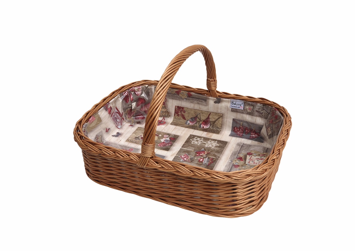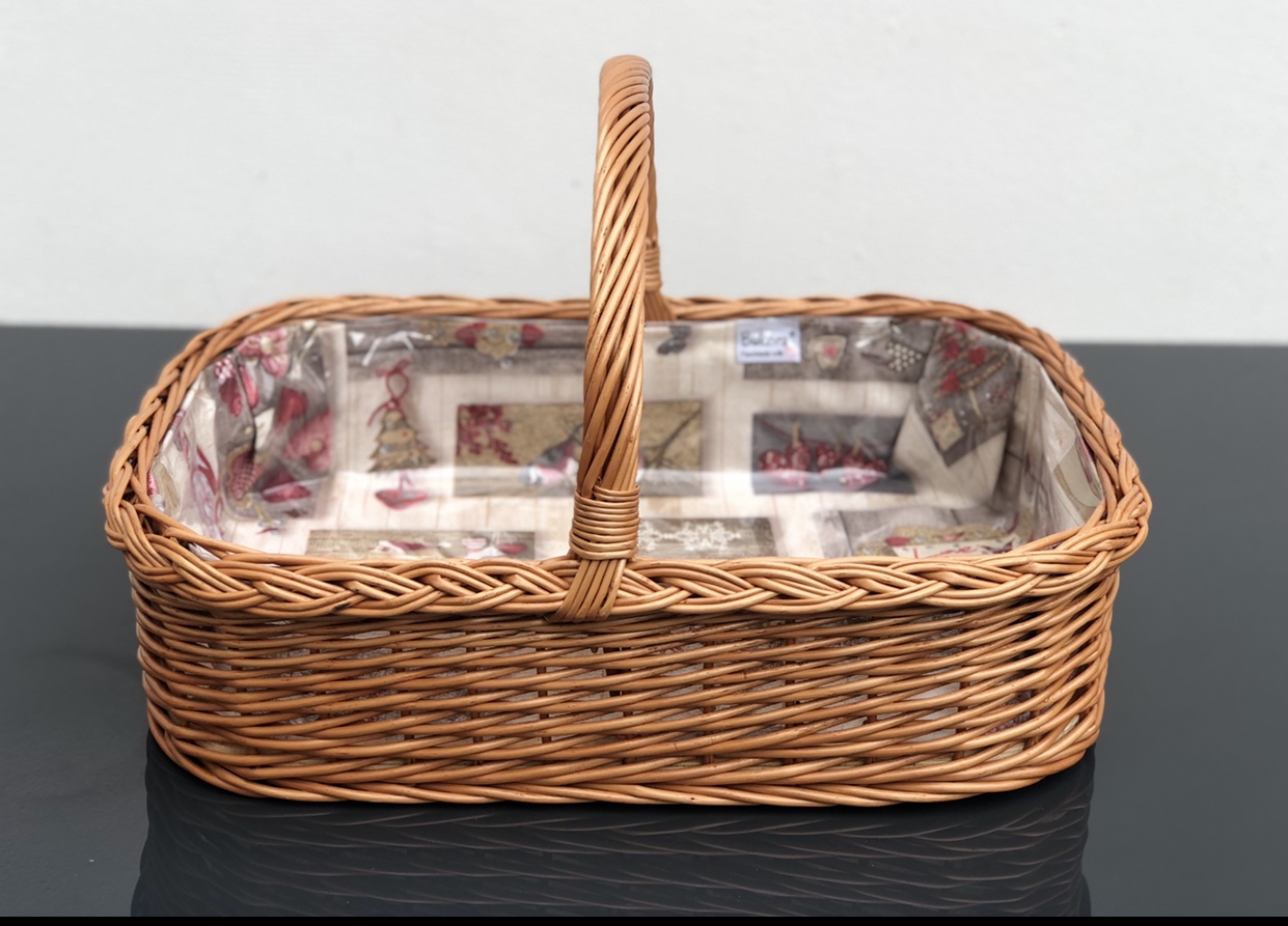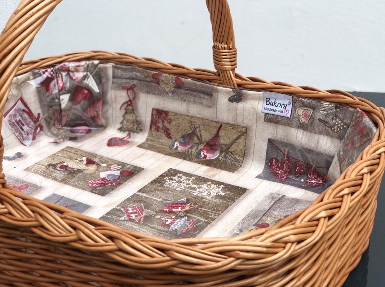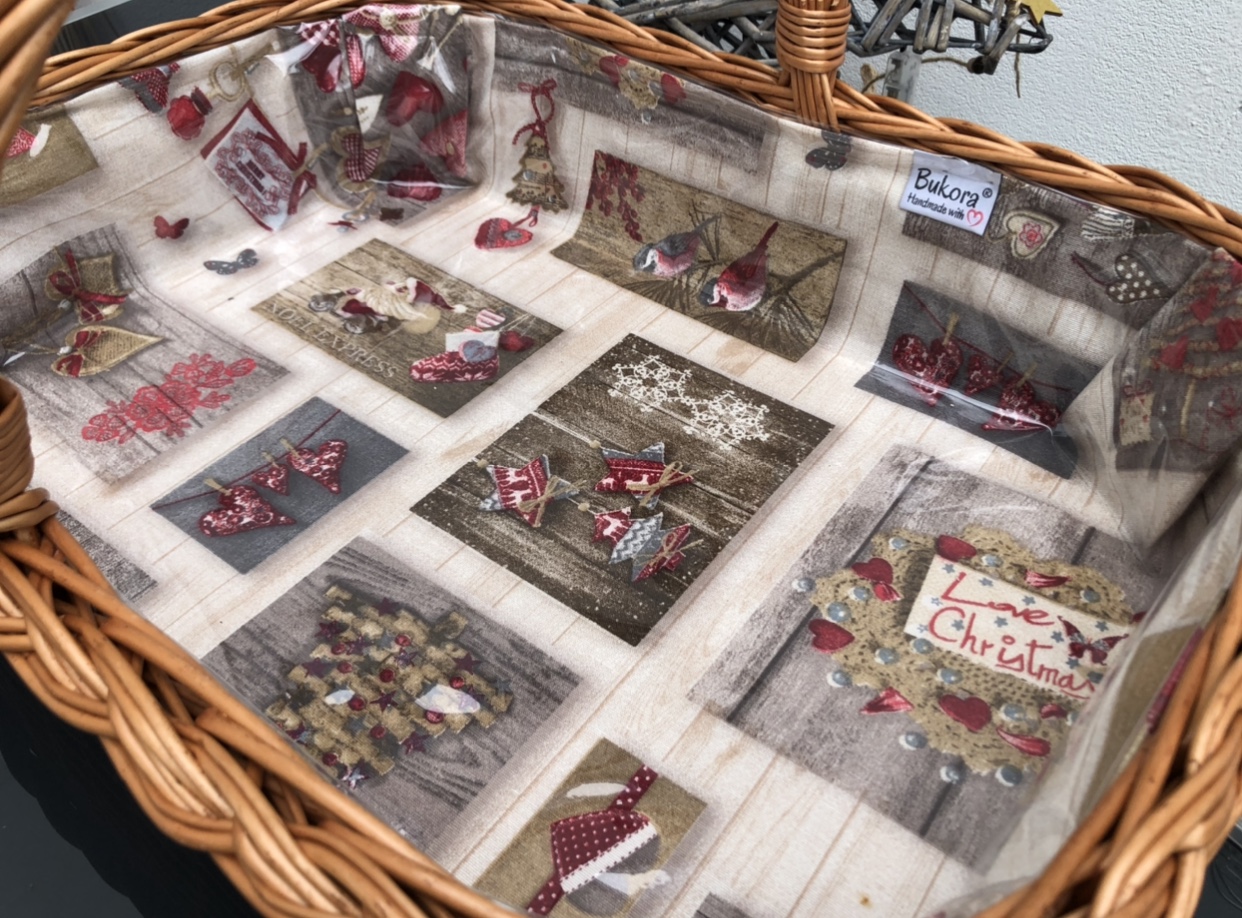 Stabiles Weidentablett mit Henkel und Futter garniert mit einem schönen Weihnachtsstoff.