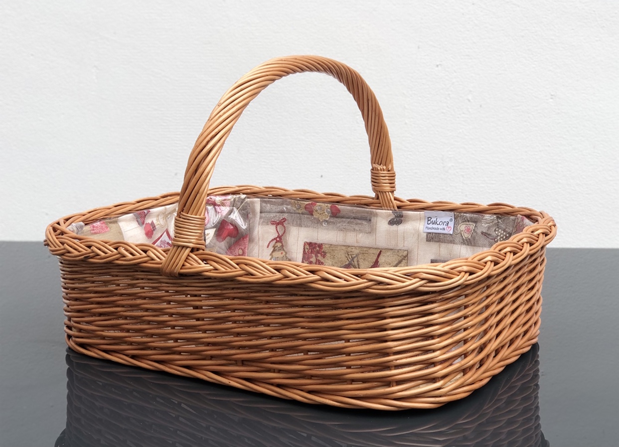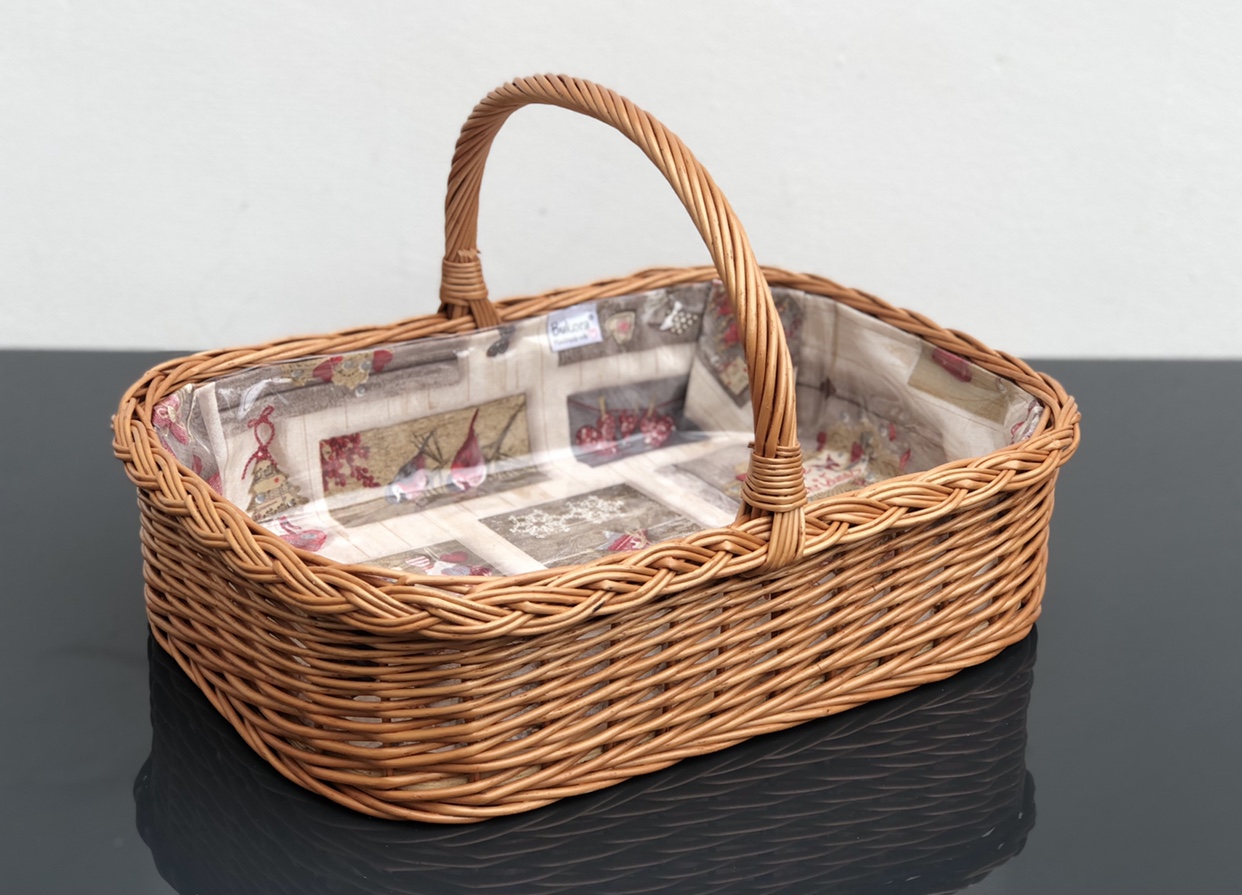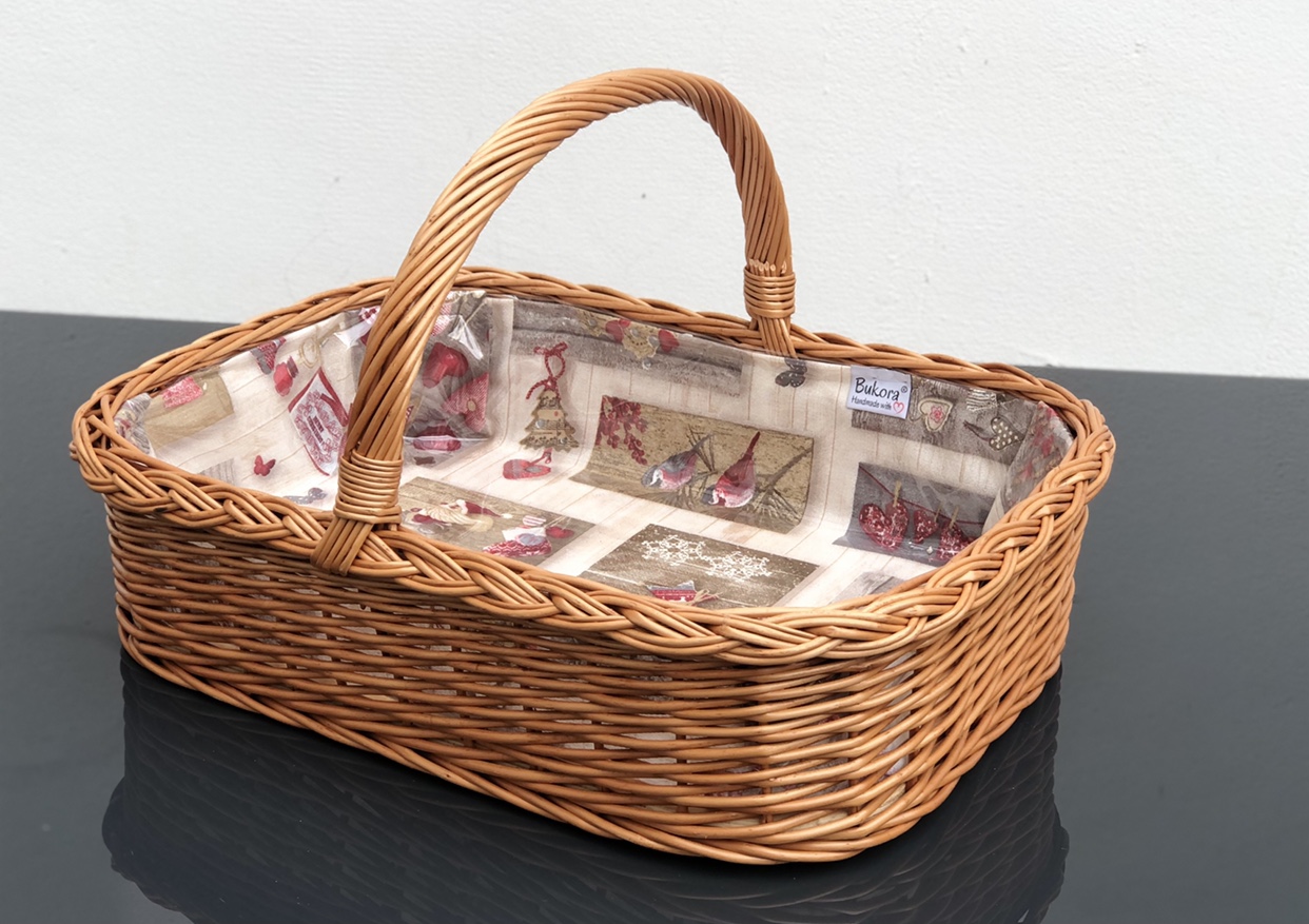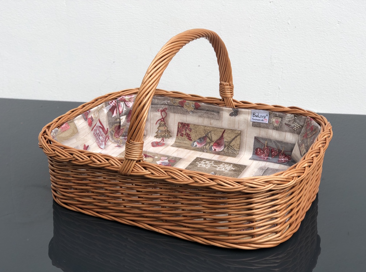 Stabiles Weidentablett mit Henkel und Futter garniert mit einem schönen Weihnachtsstoff.