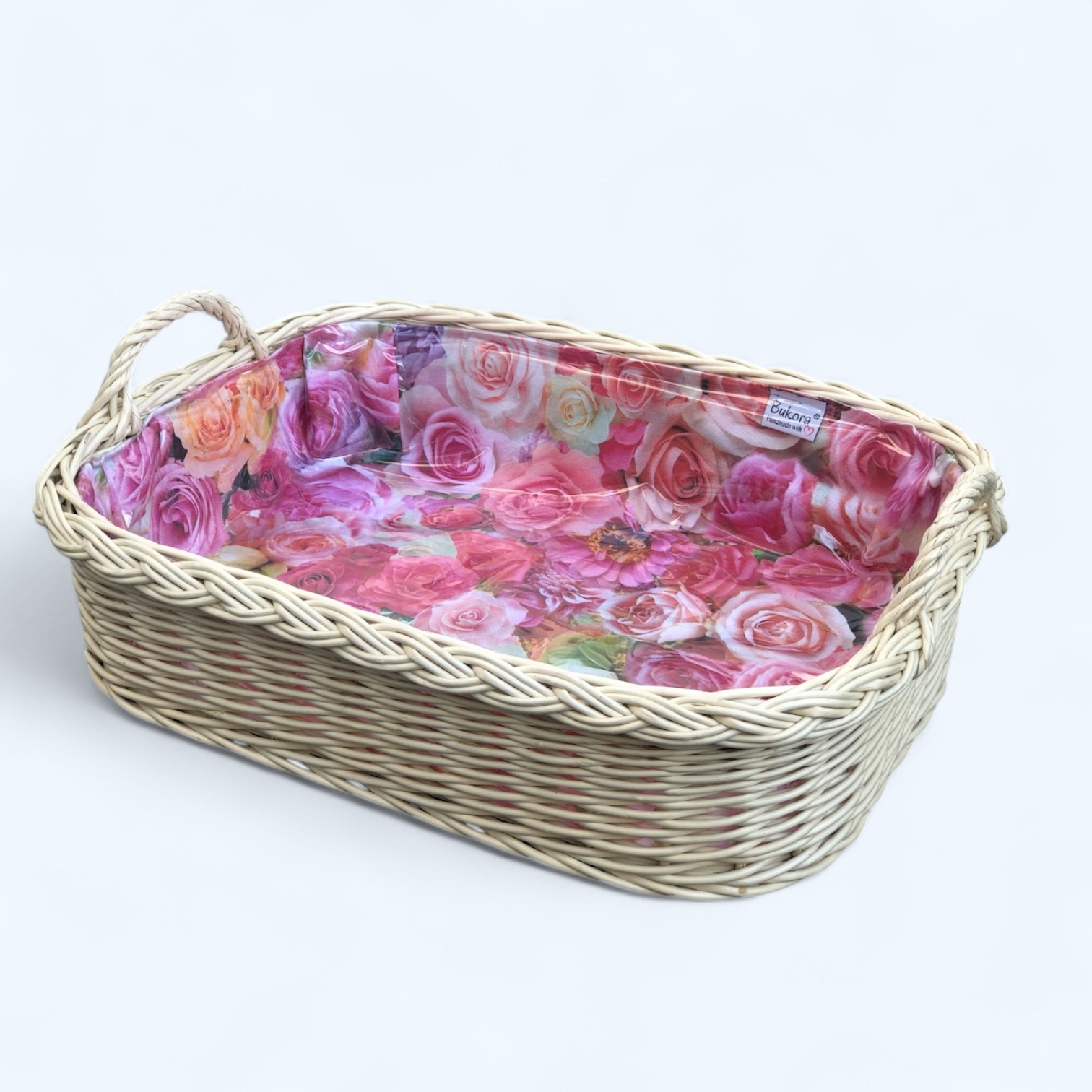Bukora® Korbtablett aus heller Weide mit Futter Rosenmuster mit 2 Griffen