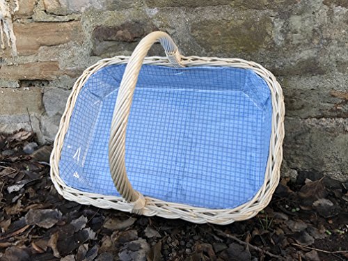 Stabiles Weidentablett mit Henkel und Futter garniert in Blau kariert. Das Tablett ist aus heller Weide geflochten und ist hervorragend verarbeitet. Es ist absolut alltagstauglich und darf in keinem Haushalt fehlen und wird Sie mit Sicherheit nicht enttäuschen. Auch in anderen Stoffen lieferbar. Bitte beachten sie die Maße. Bügelhöhe 32 cm x Randhöhe 13 cm