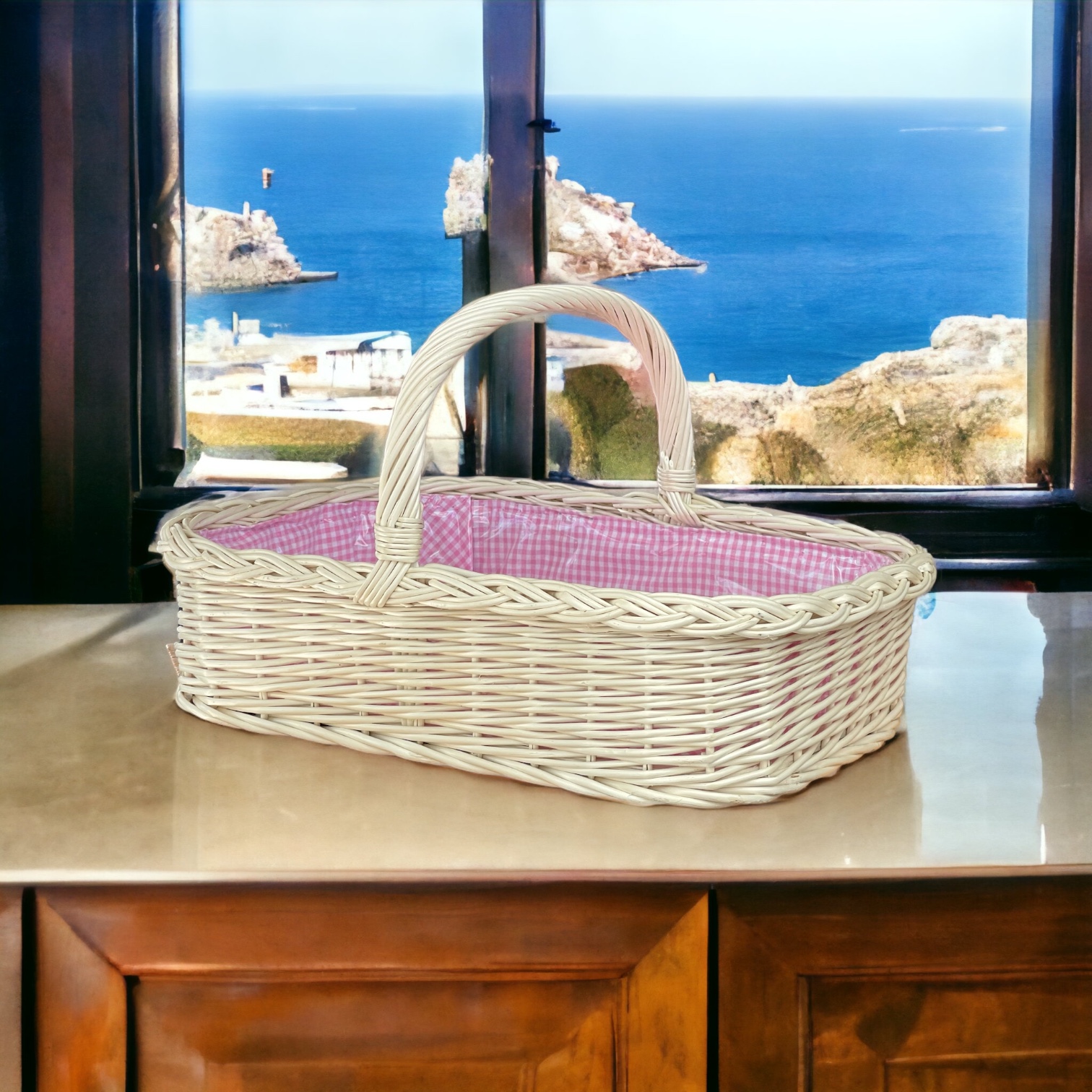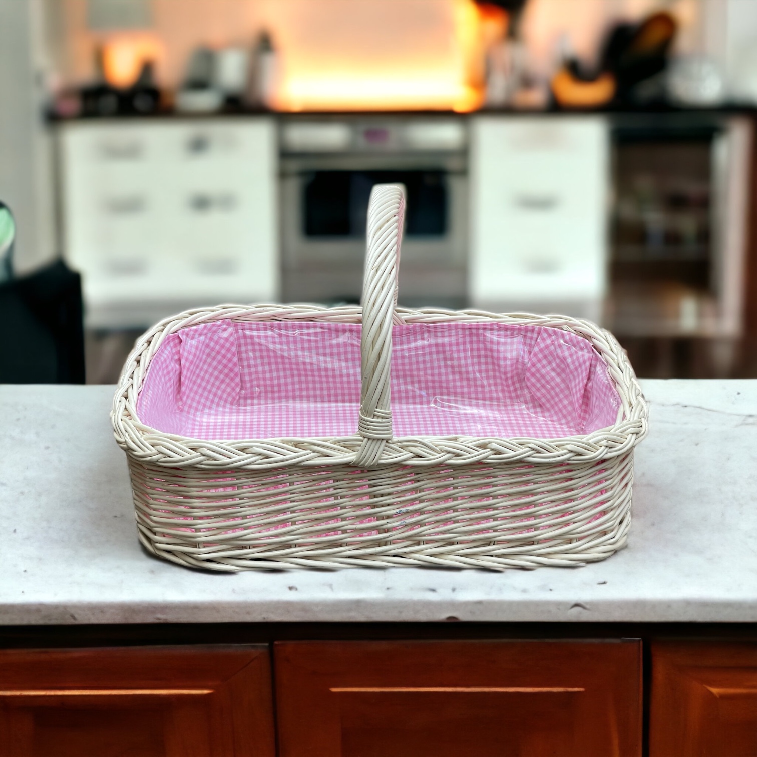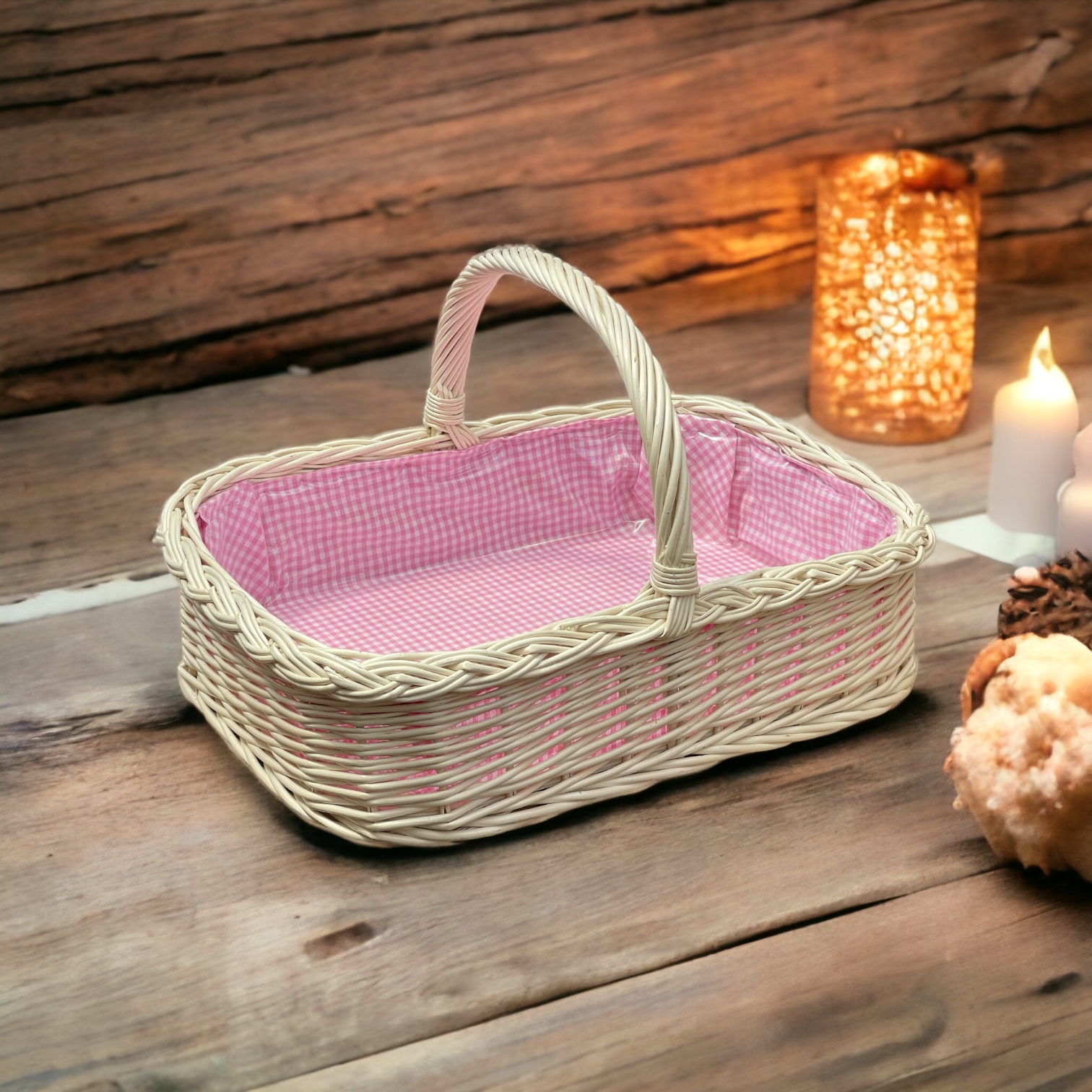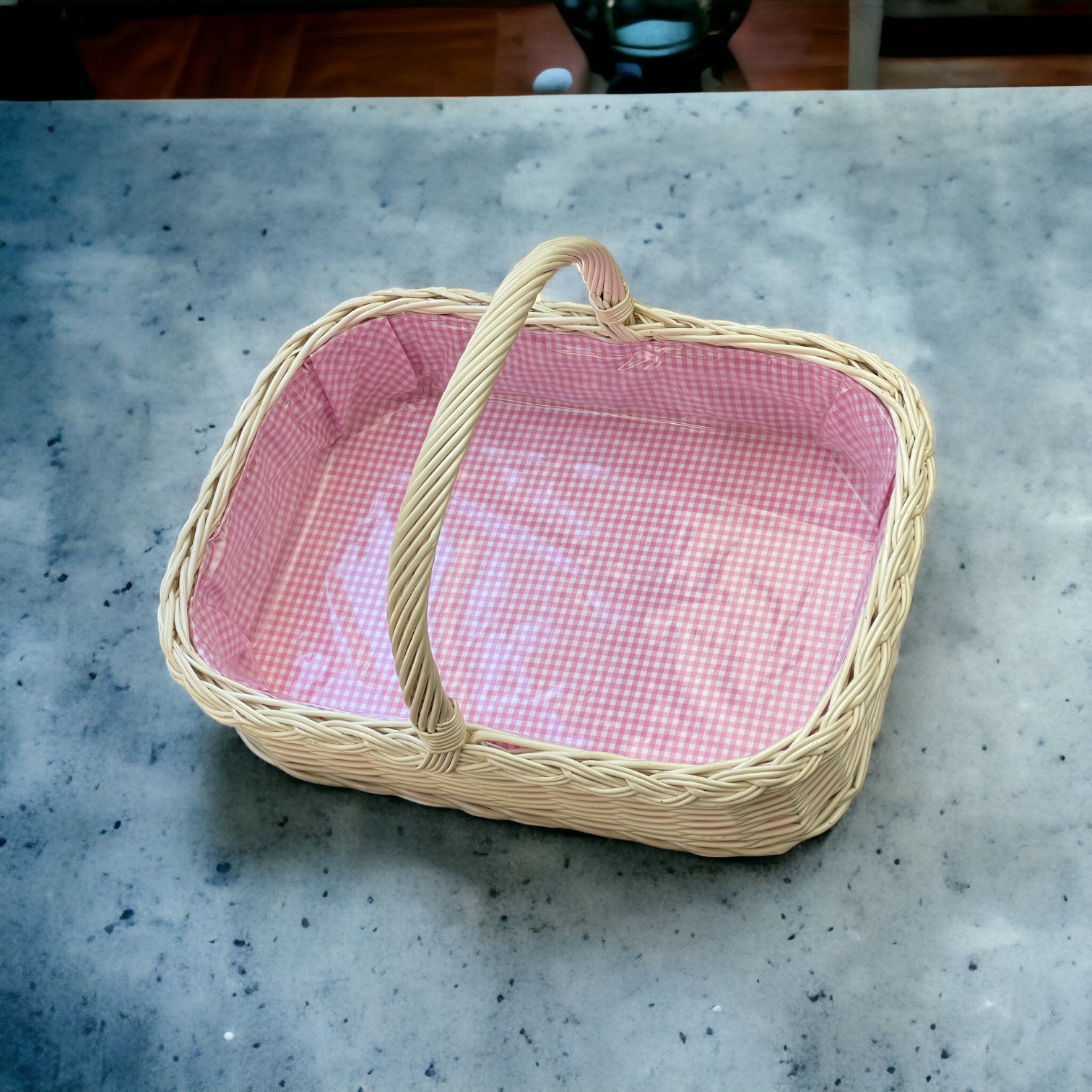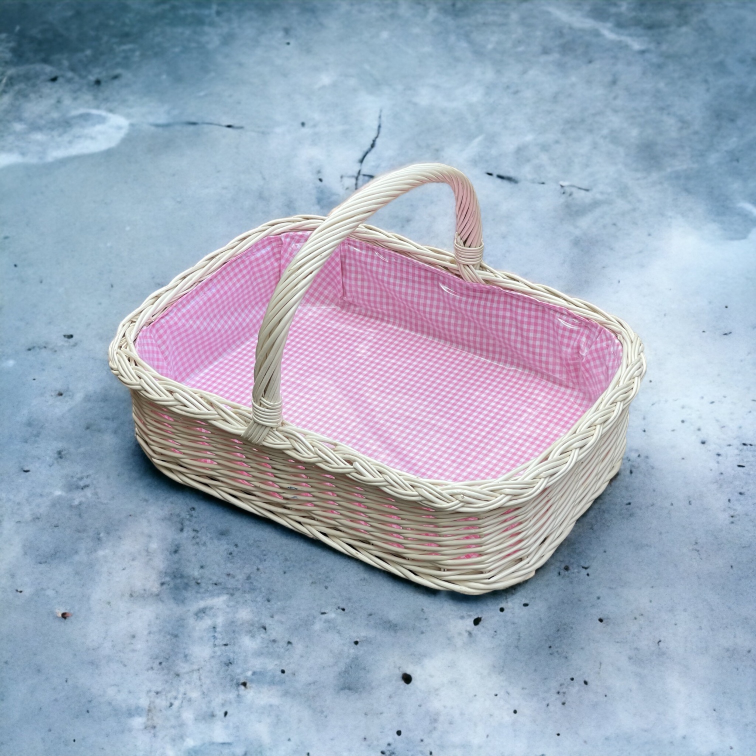 Tablett aus heller Weide mit Futter Rosa kariert" 2 Griffe"
