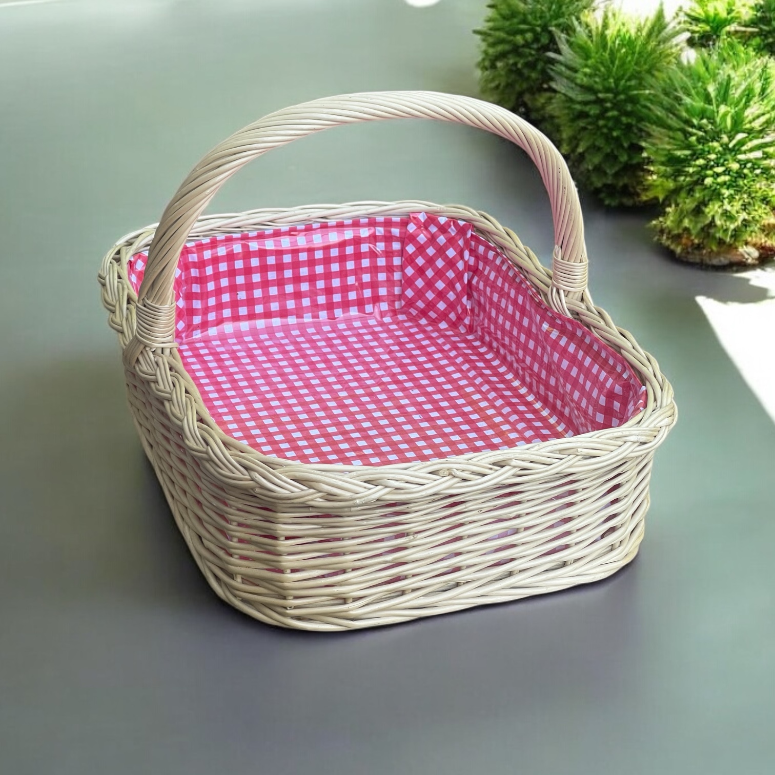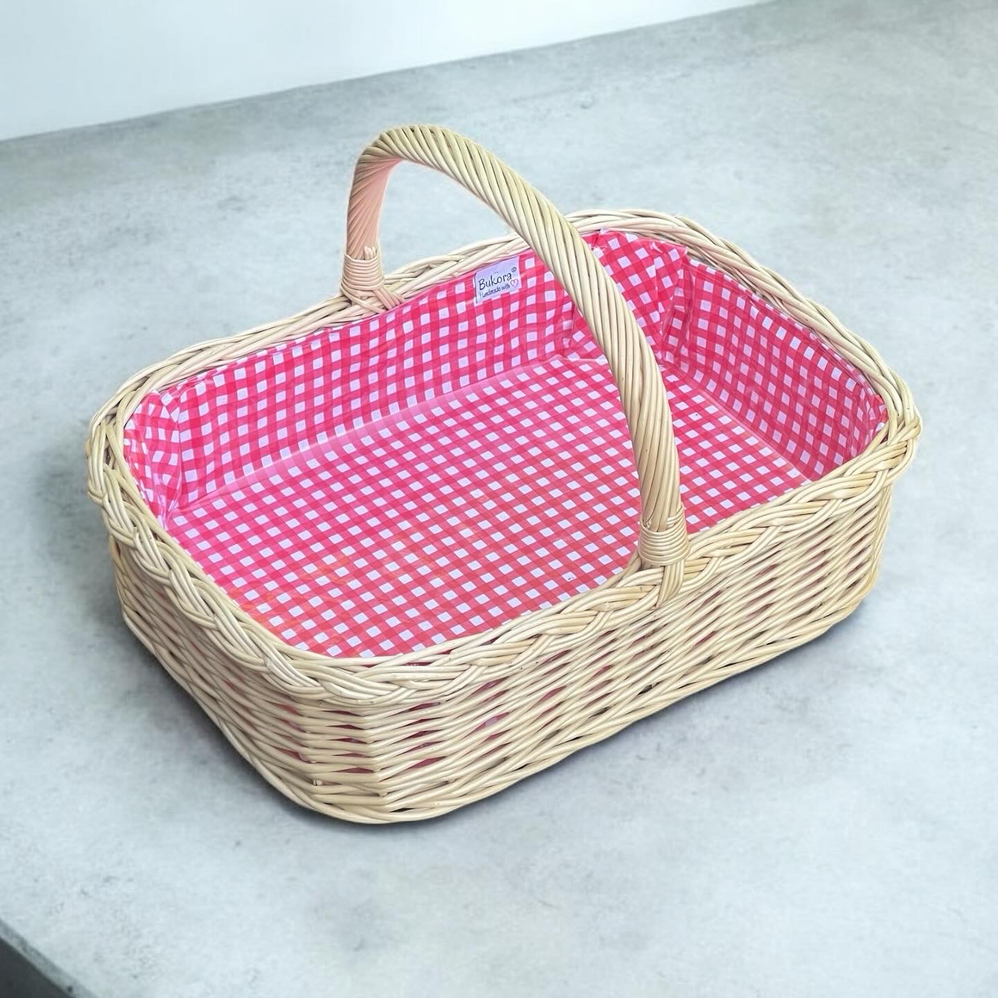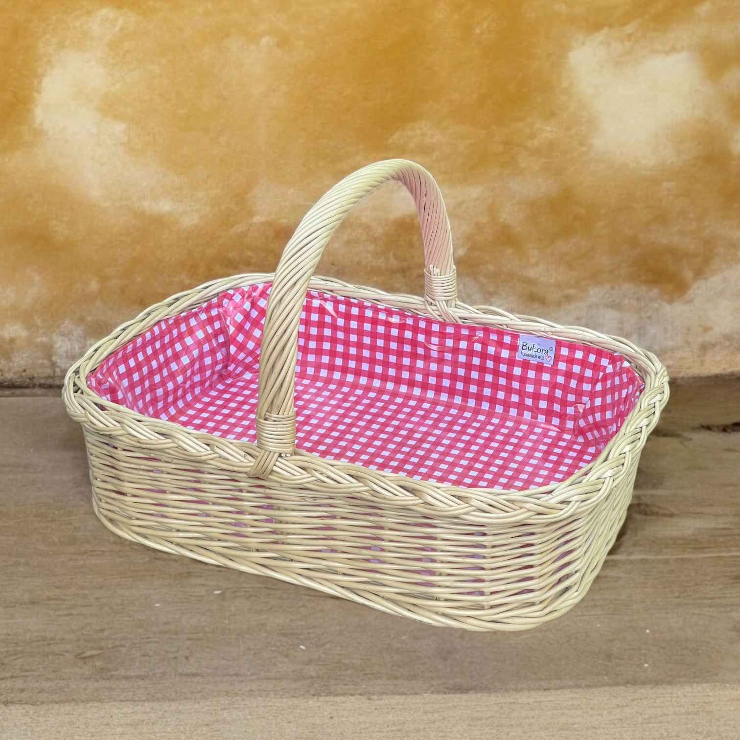 Das handgeflochtene Bukora Korb-Tablett aus heller Weide mit rot-weiß karierter Stoffeinlage und zusätzlicher Folie ist ideal zum stilvollen Servieren. Ob für Frühstück, Familienfeste oder als dekorativer Tragekorb – dieses hochwertige Weidentablett ist funktional, hygienisch und passt sich jeder Einrichtung an.