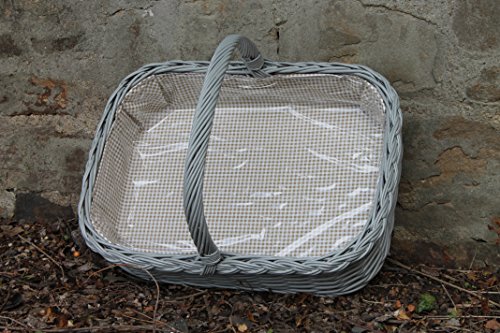 Stabiles Weidentablett mit Henkel und Futter garniert in Grau lackiert. Das Tablett ist aus gesottener Weide geflochten und ist hervorragend verarbeitet. Es ist absolut alltagstauglich und darf in keinem Haushalt fehlen und wird Sie mit Sicherheit nicht enttäuschen. Auch in anderen Stoffen lieferbar. Bitte beachten sie die Maße. Bügelhöhe 32 cm x Randhöhe 13 cm