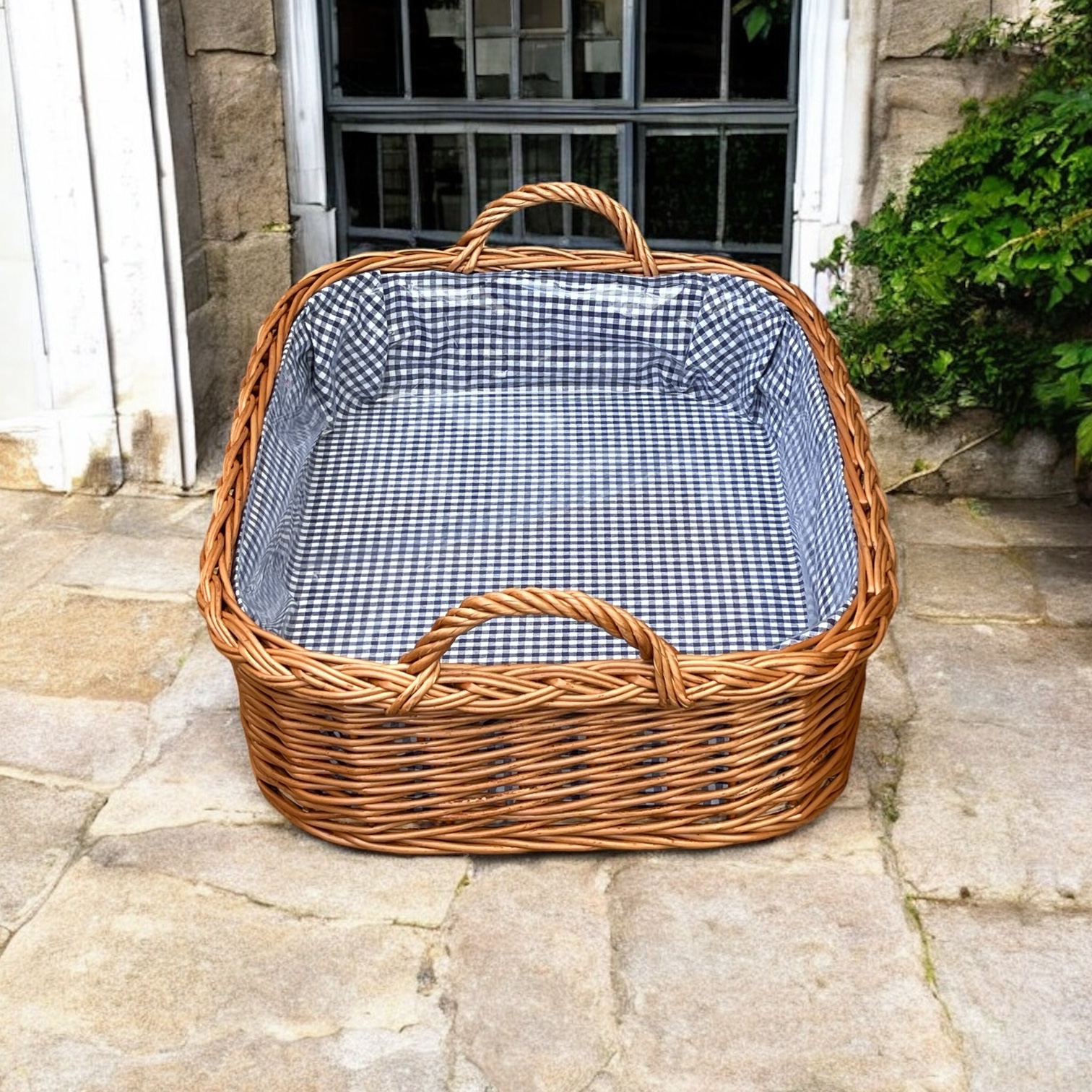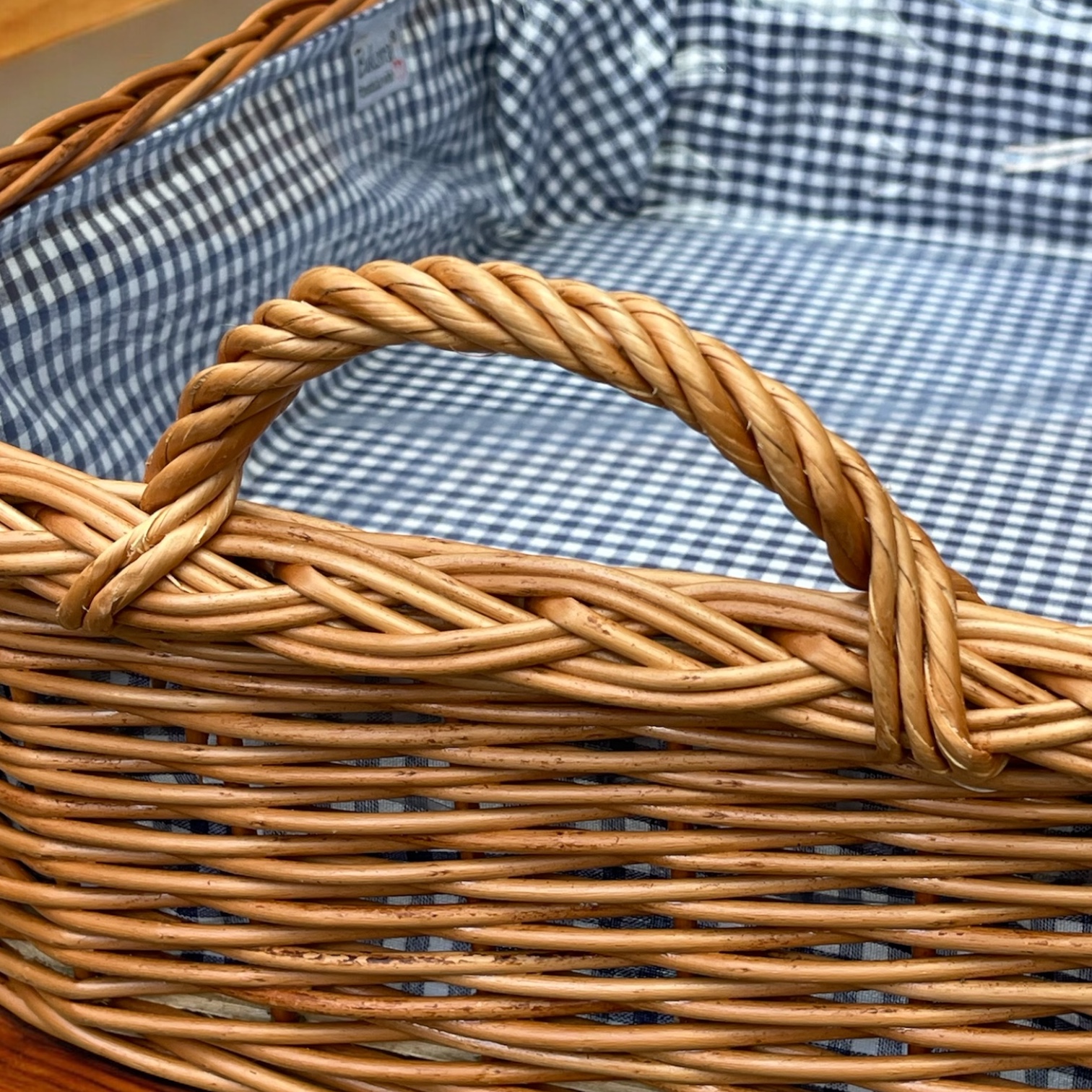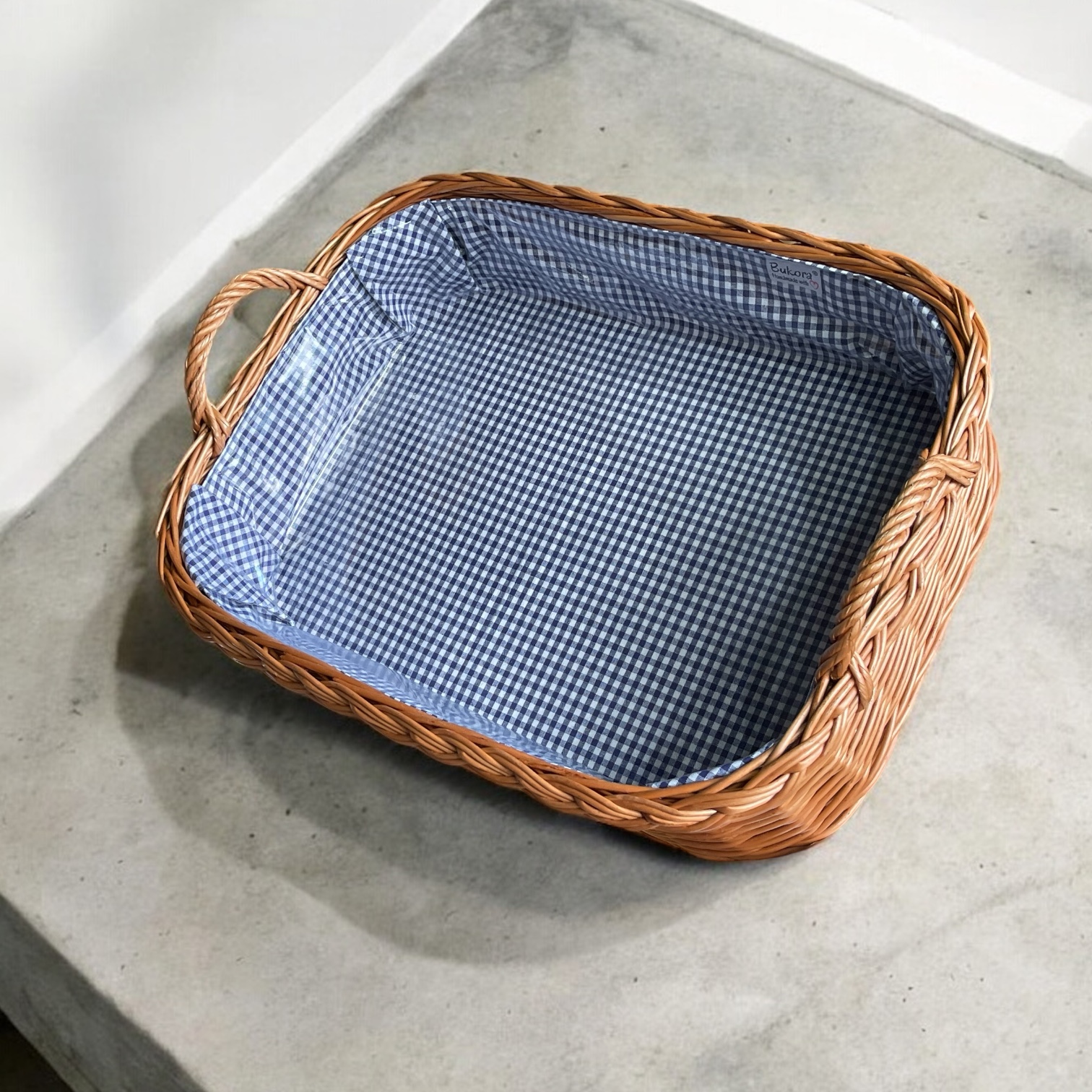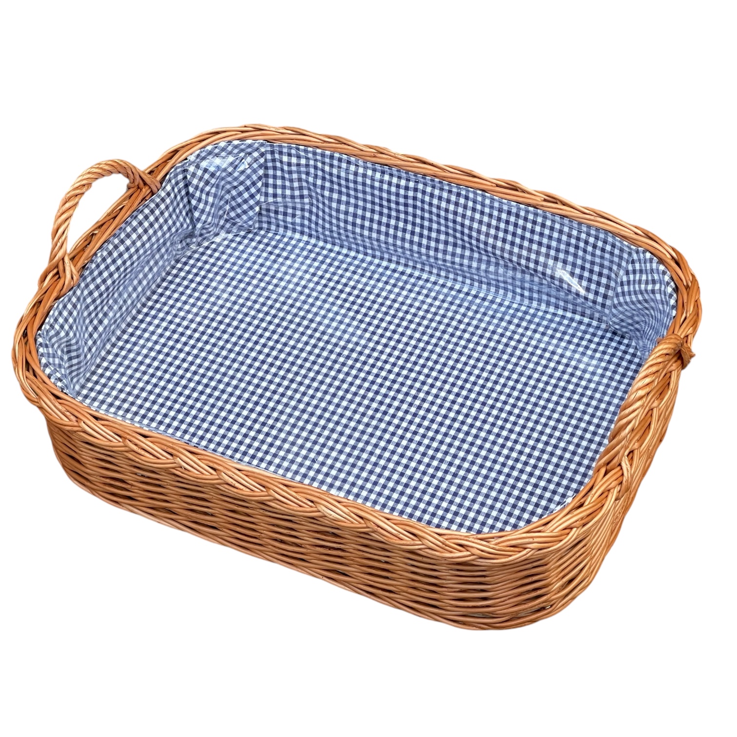 Stabiles Weidentablett mit Henkel und Futter garniert in Blau fein kariert. Das Tablett ist aus gesottener Weide geflochten und ist hervorragend verarbeitet.
