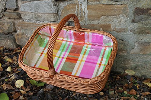 Stabiles Weidentablett mit Henkel und Futter garniert in Bunt kariert. Das Tablett ist aus gesottener Weide geflochten und ist hervorragend verarbeitet.