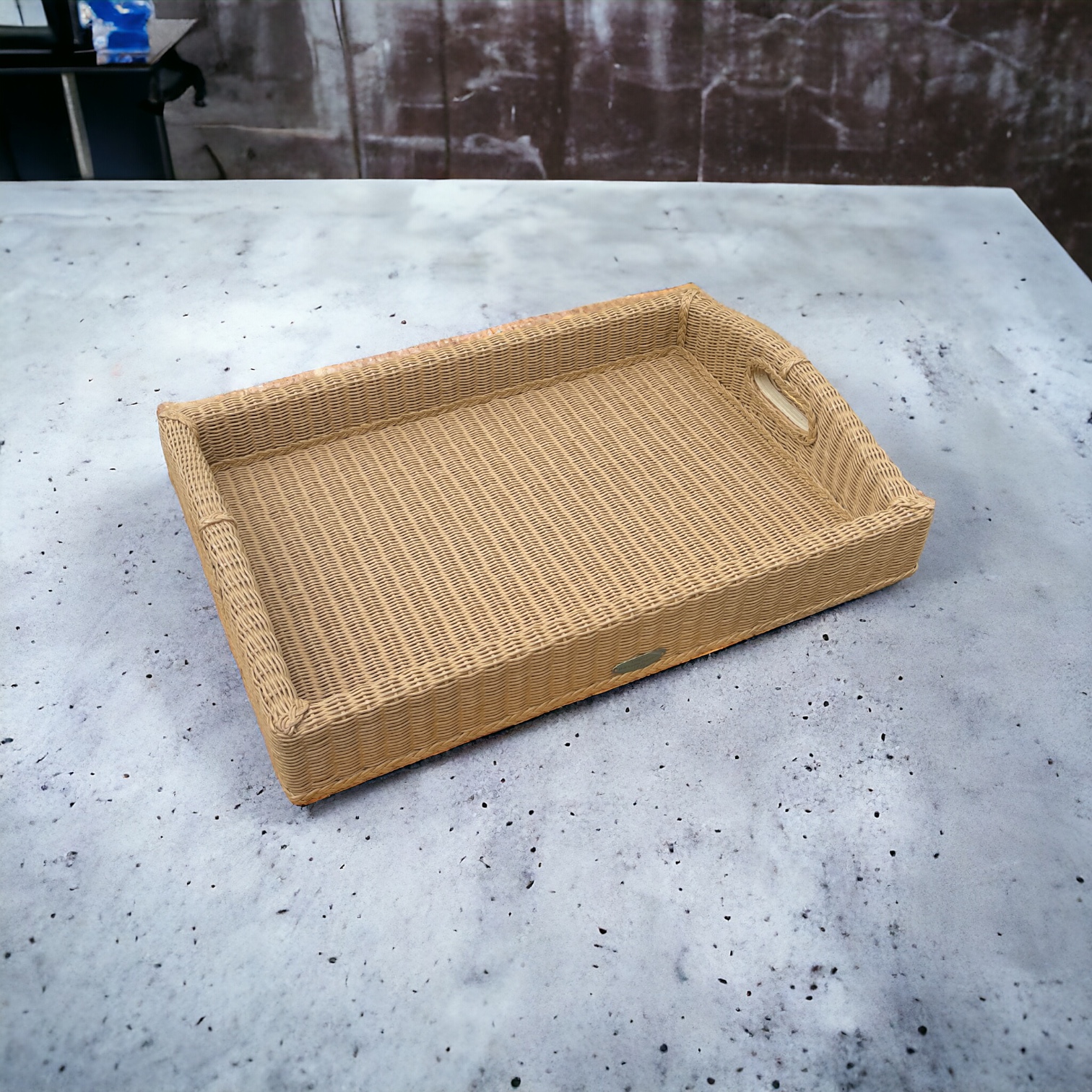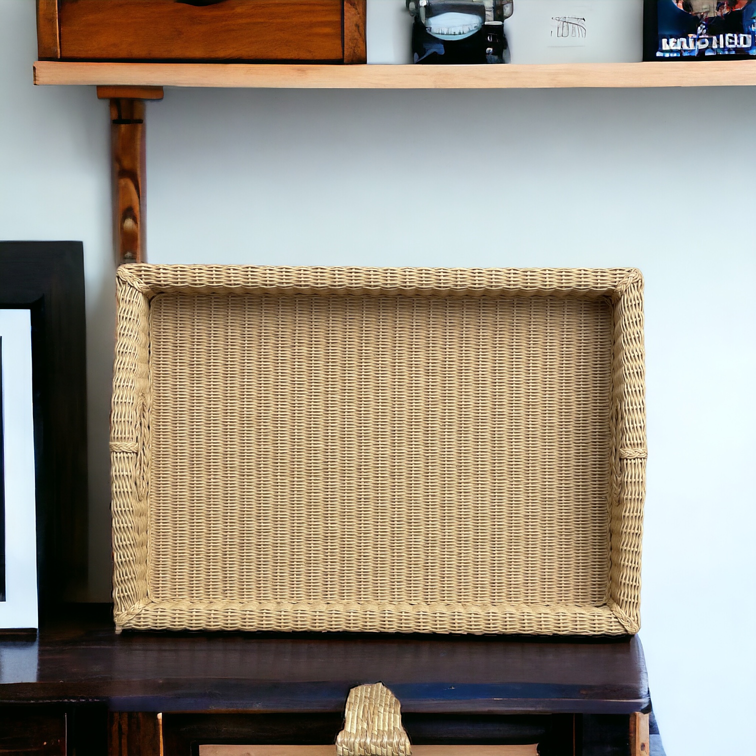 Sehr stabiles Korbtablett in Loomgewebe gefertigt.Der Boden ist aus Holz und mit Loomgewebe überzogen.