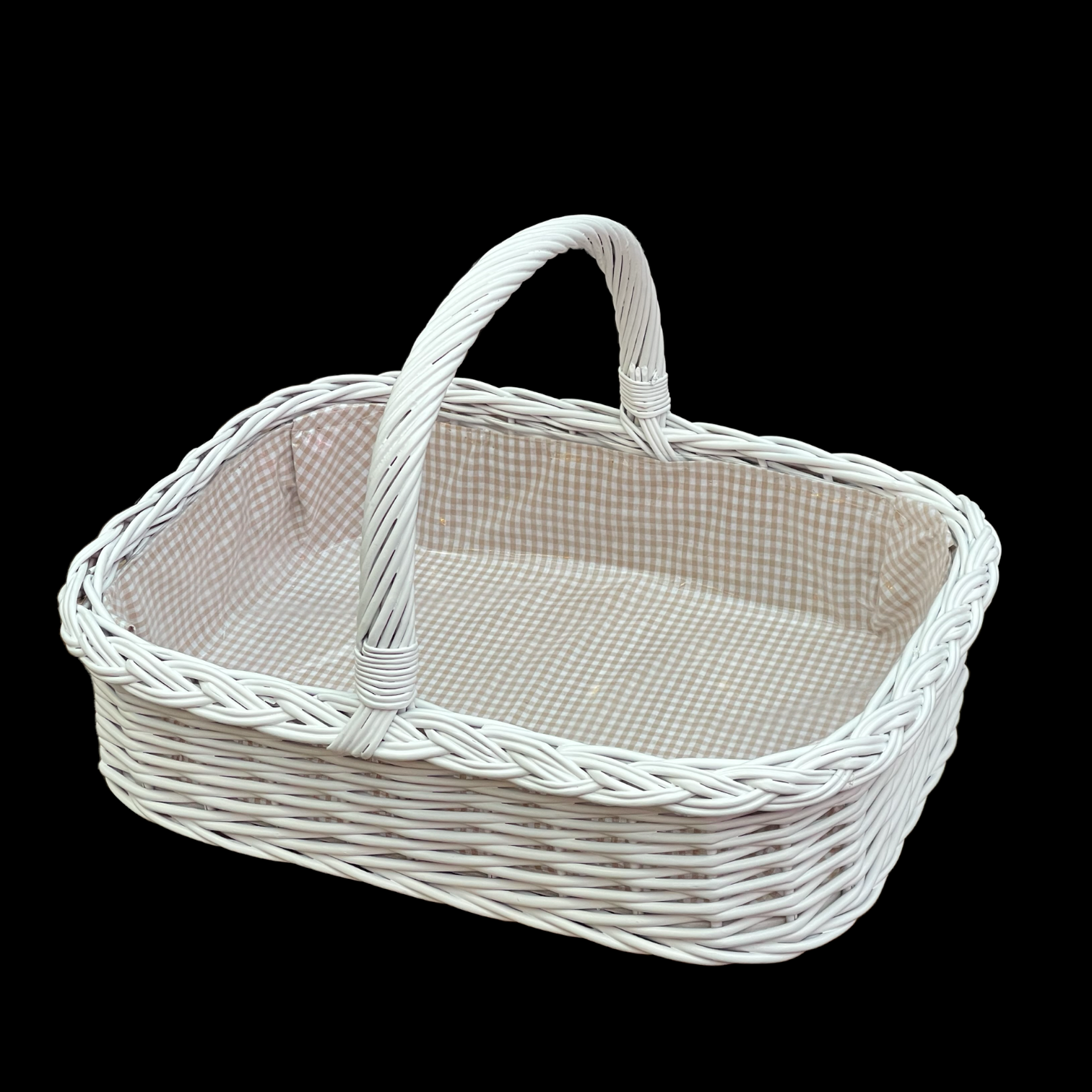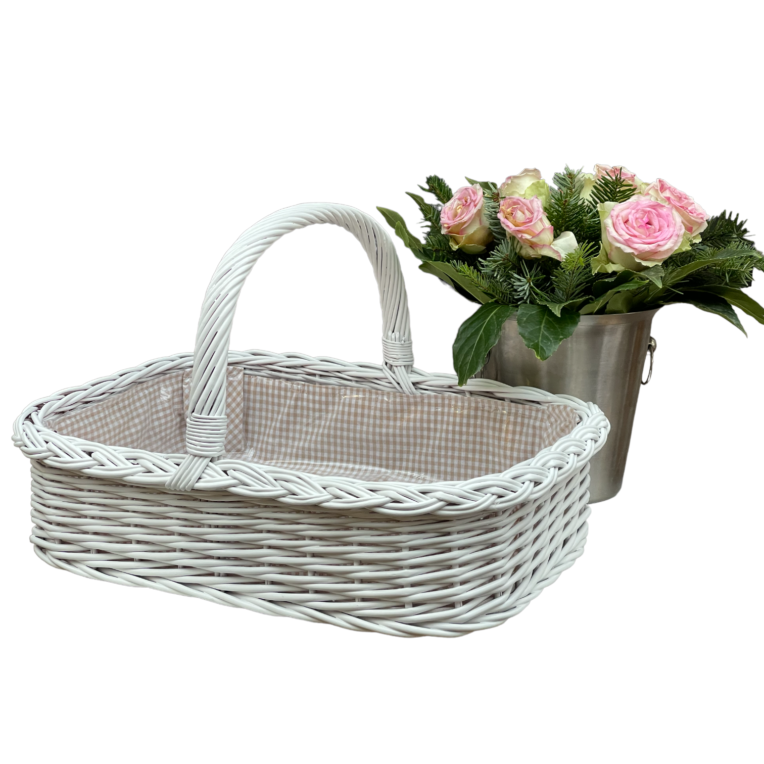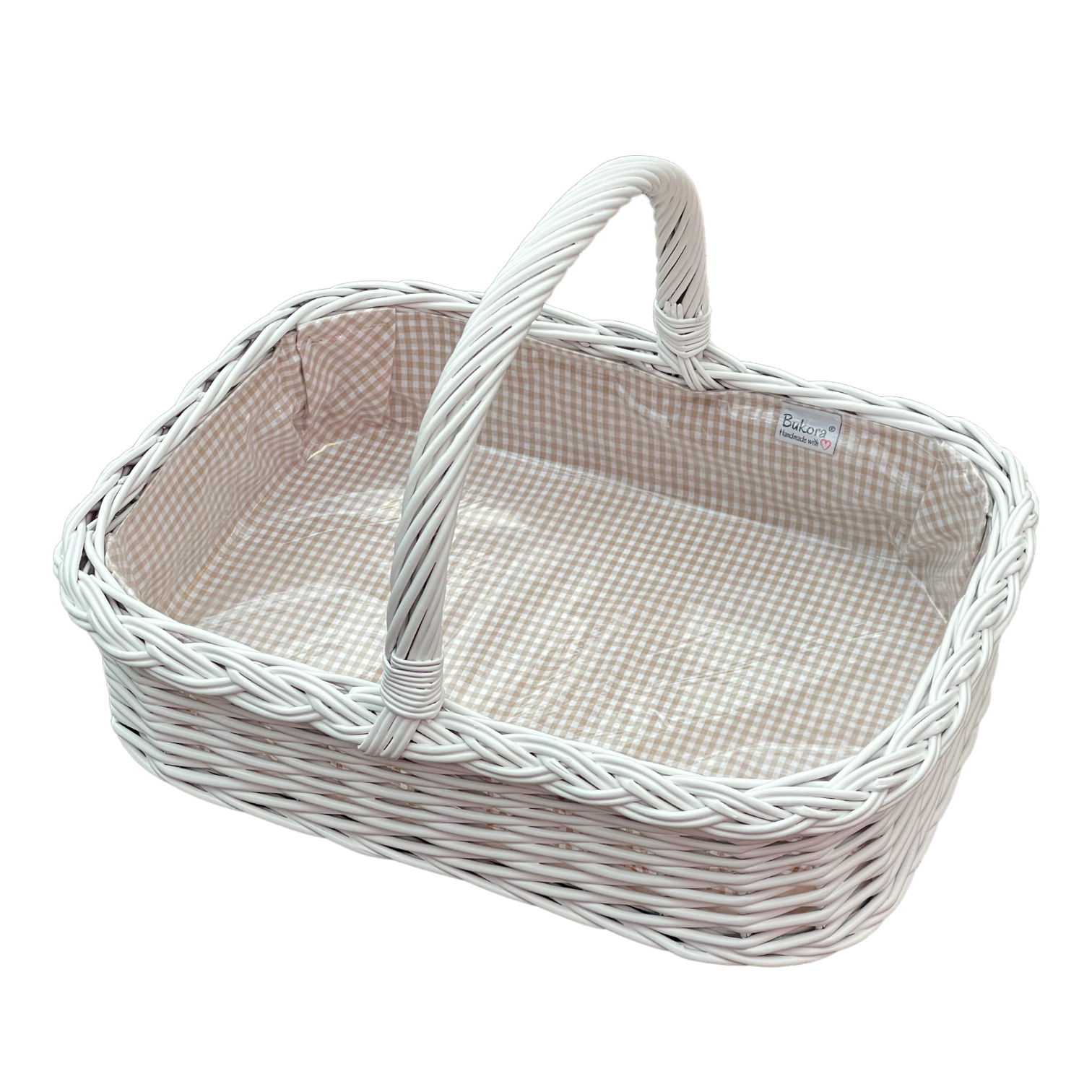 Bukora® Korbtablett Weiß lackiert mit Futter Olivegrau fein kariert.