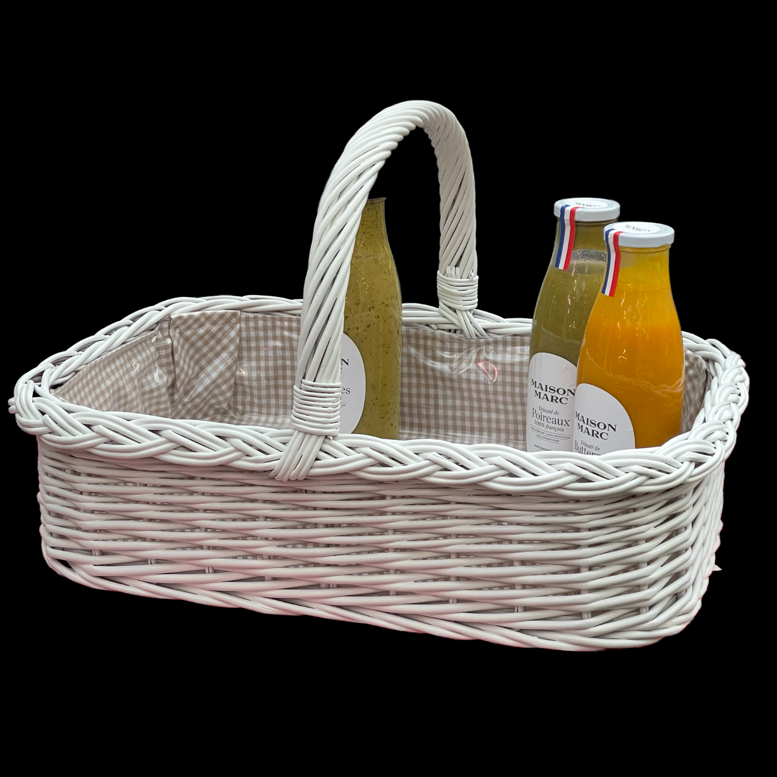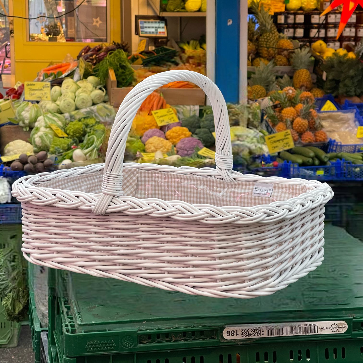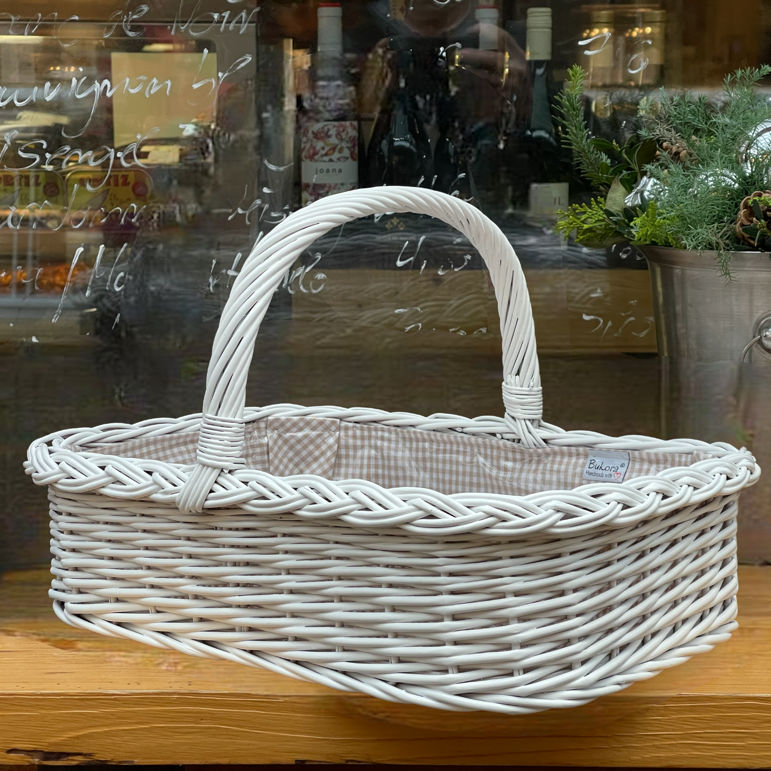 Bukora® Korbtablett Weiß lackiert mit Futter Olivegrau fein kariert.